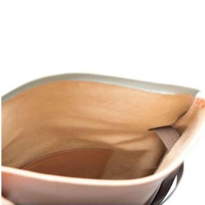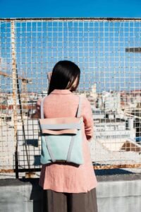 Soft pink leather in one side. Back in light blue leather. Grey elastic. and adjustable straps in Grey Suede. Two inner pockets. Dimensions: 35 x 33 cm. Adjustable Straps: 70cm – 80cm. With an extra handle strap. REF. MMBPAO. Made in Portugal